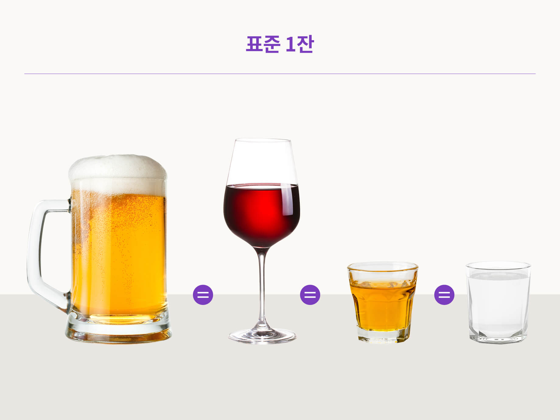 가이드라인에서 제시하는 1잔은 표준 1잔이라고 해요. 술마다 함유된 알코올 양이 다른데, 맥주, 막걸리, 와인, 위스키 등 일반적으로 술과 어울리는 잔에 술을 따르면 알코올 양은 대략 8~10g으로 비슷해요. 그래서 이 한 잔 술을 표준 1잔이라고 정했어요. 평소 생맥주를 즐긴다면 500cc잔으로 하루에 2잔을 넘기지 않으면 적정 음주라고 할 수 있는 거죠. 그런데 소주는 예외예요. 소주는 우리가 알고 있는 소주잔 1잔이 표준 1잔이 아니라 1/4병이 표준 1잔이에요. 소주 1병은 표준잔으로 4잔이 되는 셈이죠.