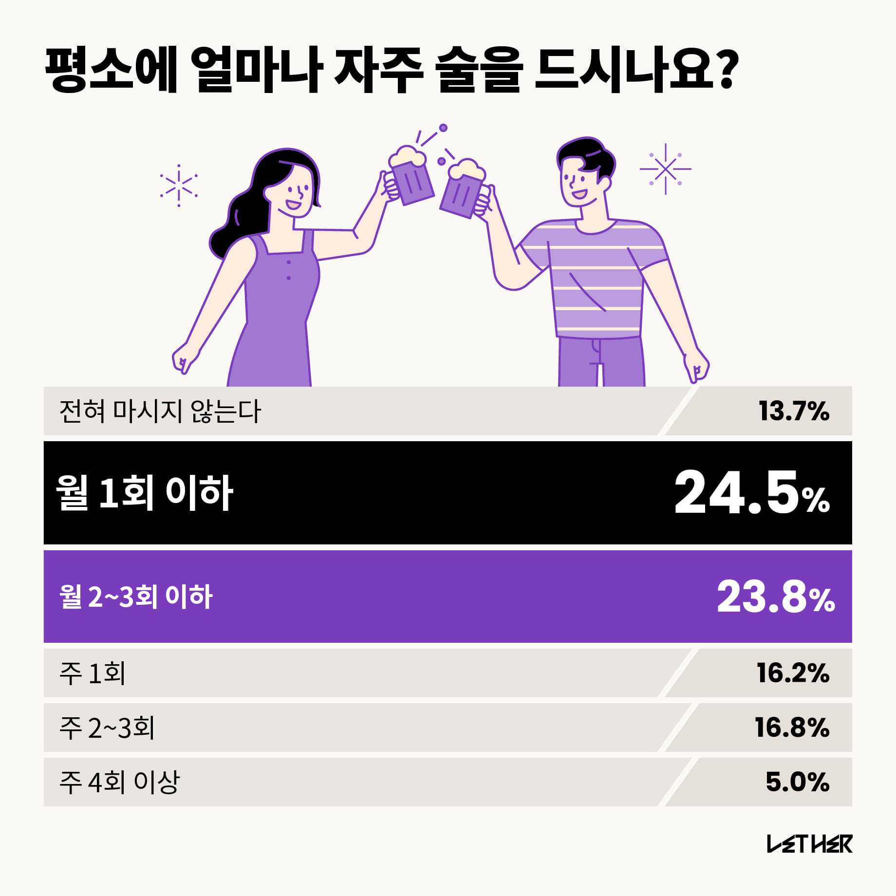 전체 응답자 중 86.3%가 술을 마신다고 답했으며, 이중 가장 많은 응답자가 월 1회 이하 마신다고 답했다. 월 2~3회 이하 마신다는 응답은 23.8%로 다음 순이었다. 한편 전혀 술을 마시지 않는다고 응답한 사람은 13.7%였는데, 연령대 별로 보면 40대가 가장 많고 20대가 가장 적었다.