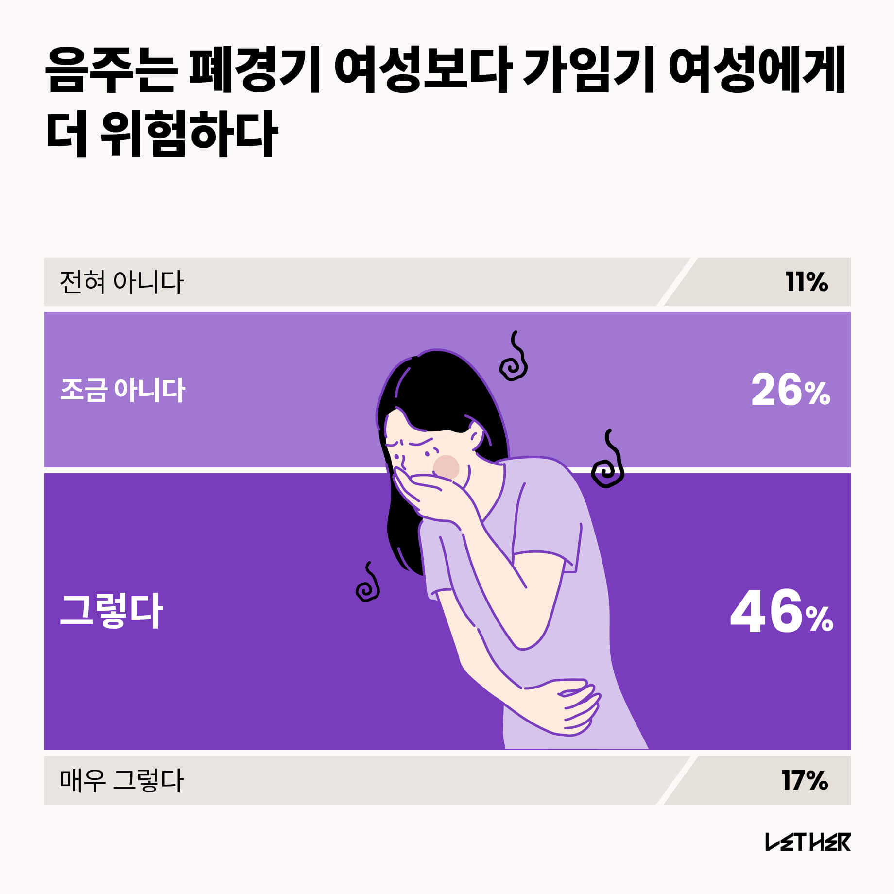 나이와 직업에 관계없이 63%의 여성이 가임기 여성에게 음주가 더 위험하다고 꼽았다.