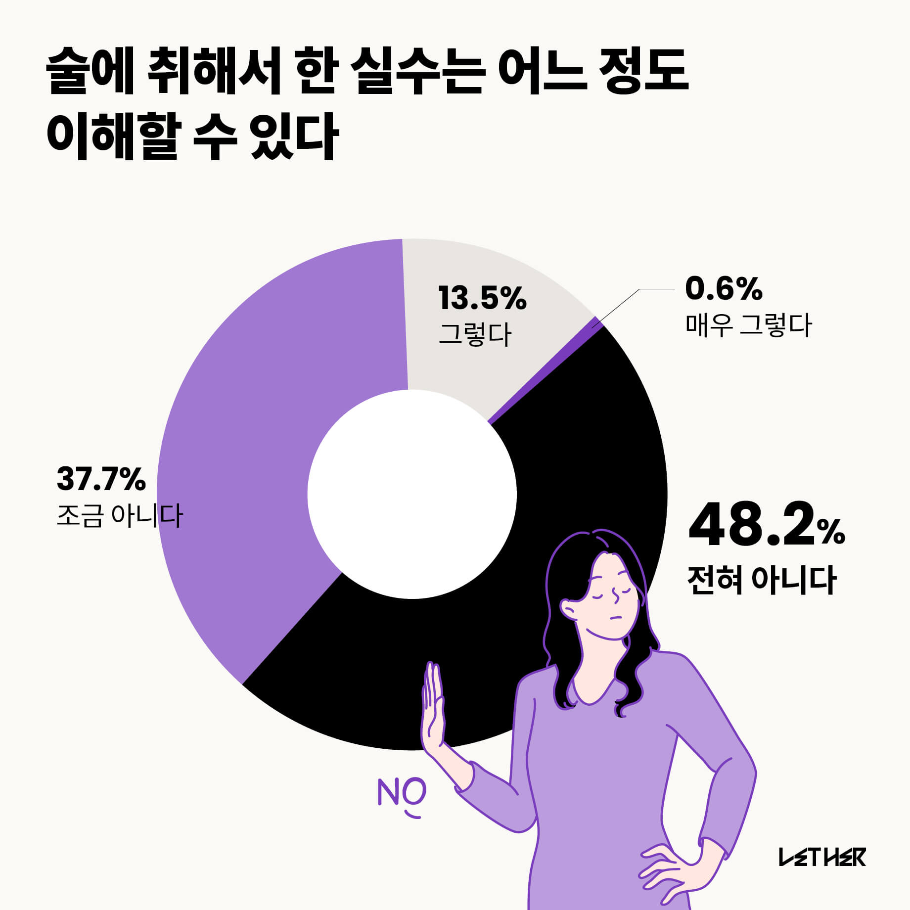 술에 취해서 한 실수에 대해 48.2%는 전혀 이해할 수 없다고 답했다. 직업군 별로 보면 사무/기술직으로 일하는 30대가 가장 엄격한 태도를 보였다. 반면, 그렇다와 매우 그렇다를 선택하며 실수를 이해할 수 있다고 답한 사람은 연령 대비 20대가 가장 많았다.