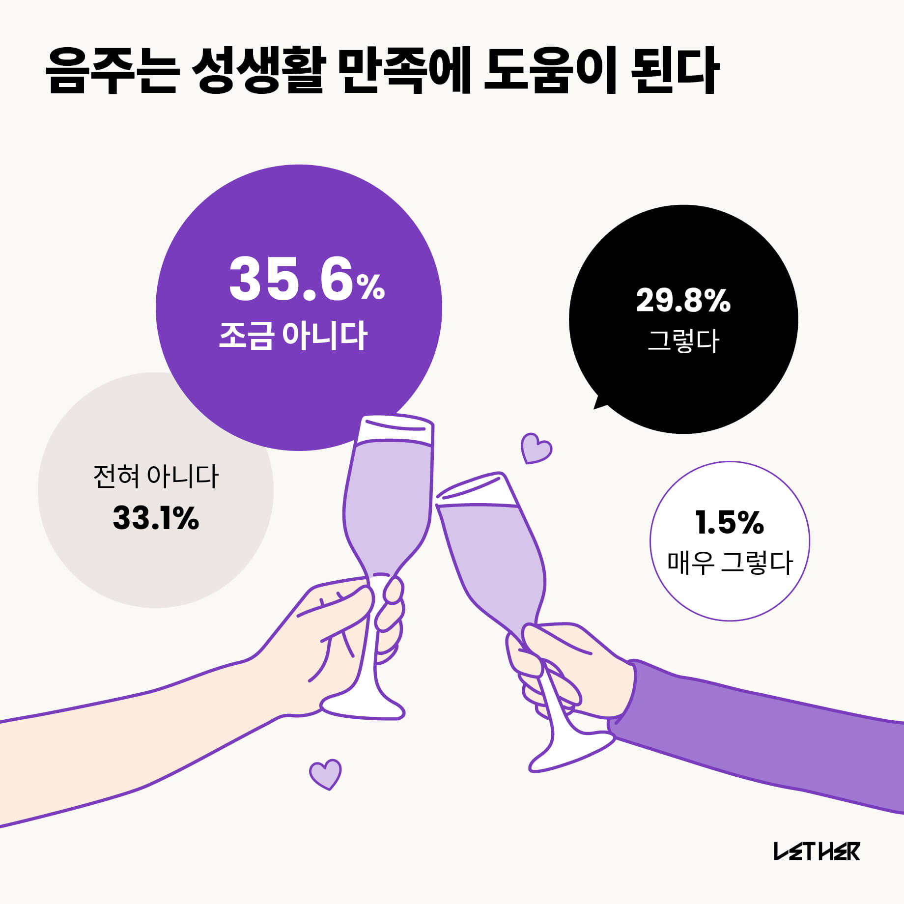 조금 아니다가 35.6%, 전혀 아니다 33.1%로, 68.7%가 음주는 성생활 만족에 도움이 되지 않는다고 답했다. 연령대 별, 직업군 별로 보면 40대 전문직 여성과 전업주부가 전혀 도움이 되지 않는다를 선택했다. 반면, 성생활 만족에 도움이 된다고 선택한 사람 중 30대와 20대 전업주부가 높은 비율로 포함되어 있어 40대 전업주부와 차이를 보였다.