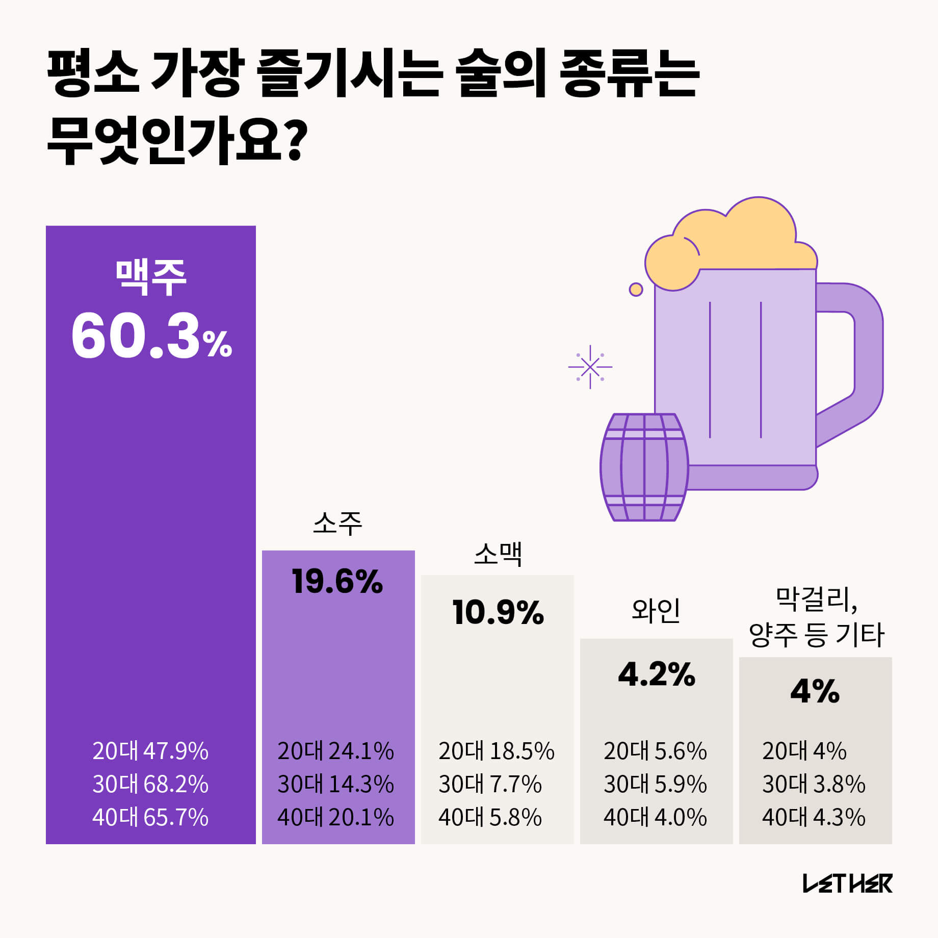 가장 즐겨 마신다고 응답한 술은 맥주(60.3%)가 압도적이었다. 특히 30대와 40대의 과반이 맥주를 선택했다. 다음은 소주, 소맥 순이었다. 소주와 소맥의 경우 연령 대비 20대에서 높은 선호도를 보였는데, 소맥은 30~40대보다 20대의 응답 비율이 2배 이상이었다. 비중이 크지는 않지만 연령이 낮을수록 도수가 높은 술을 더 좋아하는 것을 확인할 수 있었다.