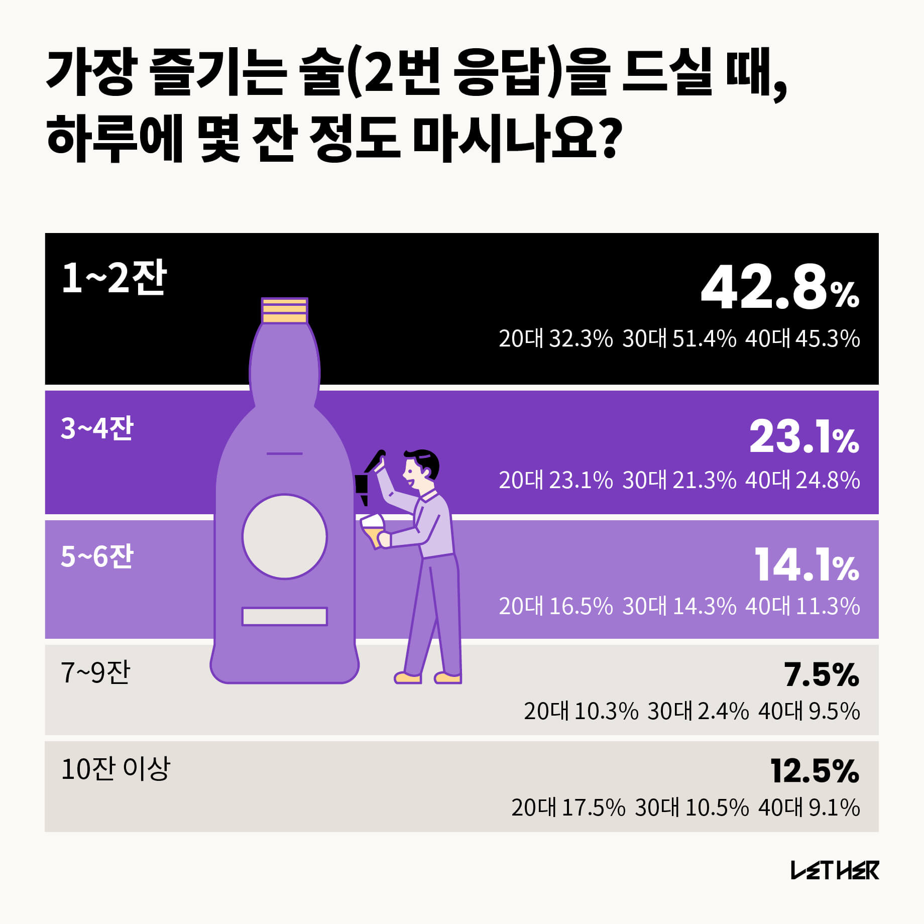 하루에 1~2잔 마신다고 응답한 사람의 비율이 42.8%로 가장 높았다. 연령 대비 흥미로운 점은 하루에 7잔 이상을 가장 많이 선택한 연령대는 20대라는 것이다. 30대와 40대에 비해 1.94배 높은 응답 비율을 보였다.