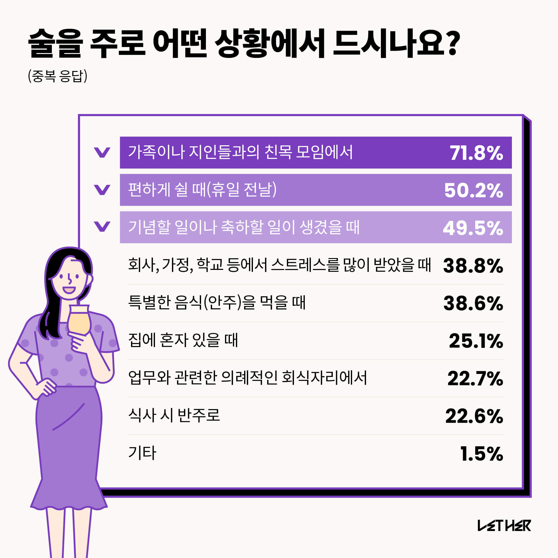 71.8%의 응답자가 주로 가족이나 지인과의 친목 모임에서 술을 마신다고 답했다. 다음으로는 편하게 쉴 때, 기념하거나 축하할 일이 생겼을 때가 각각 50.2%, 49.5%로 뒤를 이었다.