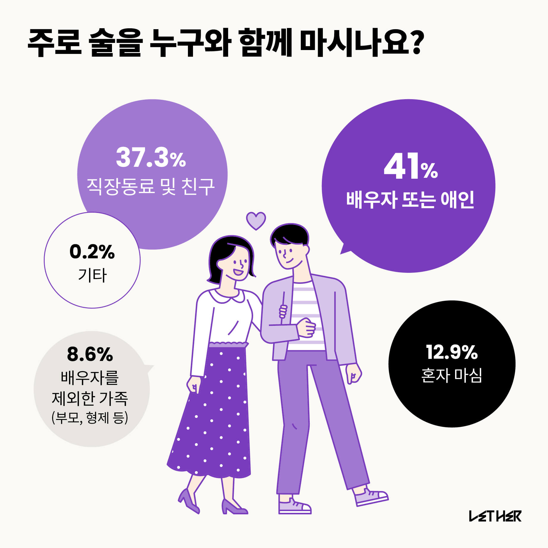 가장 많은 응답자가 배우자 또는 애인과 마신다를 선택했다. 다음은 직장동료 및 친구 37.3%, 혼자 마신다가 12.9% 순이다. 연령대 별로 살펴보면, 배우자 또는 애인을 가장 많이 선택한 연령대는 30대와 40대였고, 직장동료 및 친구를 선택한 연령대는 주로 20대였다. 연령대가 낮을수록 동료나 친구나 동료를, 높을수록 배우자를 선택하는 경향을 보였다.