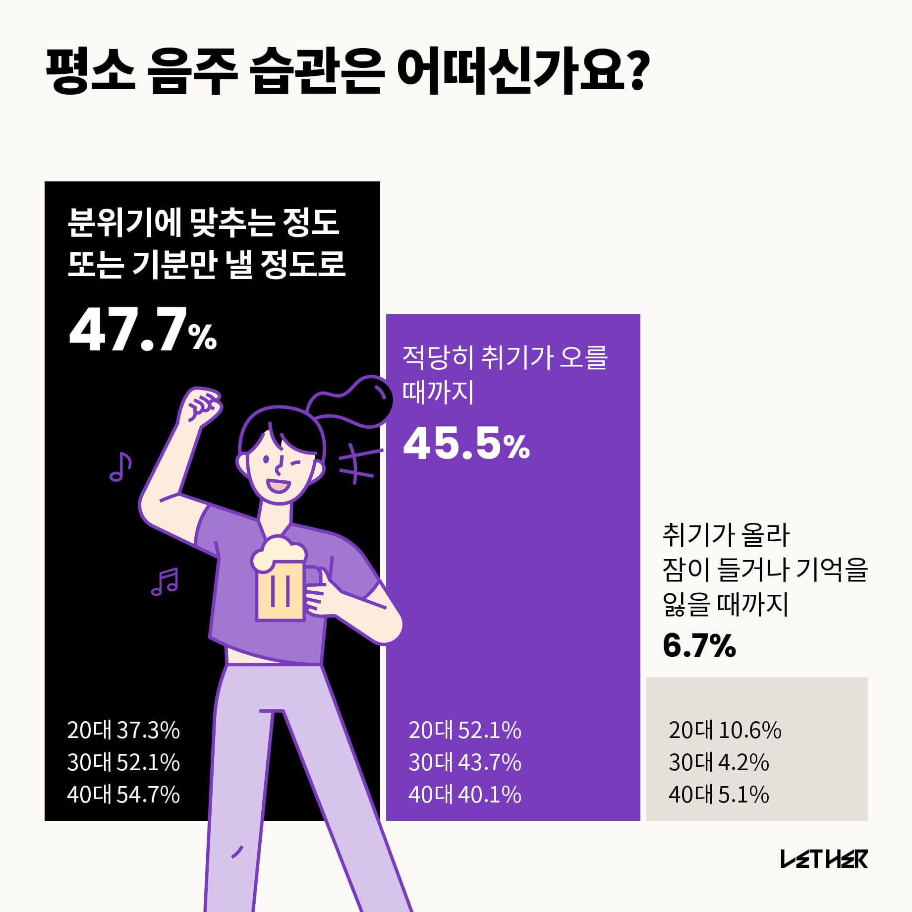 분위기에 맞추는 정도 또는 기분만 낼 정도로 마신다는 응답이 47.7%로 가장 높았다. 재미있는 점은 30대와 40대의 과반이 이 답을 선택했는데, 20대는 37.3%에 그쳤다는 점이다. 적당히 취기가 오를 때까지 마신다는 답변은 20대의 52.1%가 선택하며 30~40대와 차이를 보였다. 잠이 들거나 기억을 잃을 때까지 마신다는 응답 역시 20대가 가장 많았다. 대다수의 여성이 소량 음주하지만, 술을 많이 마시는 집단에서는 20대가 주로 취할 때까지 마신다는 것을 알 수 있었다.