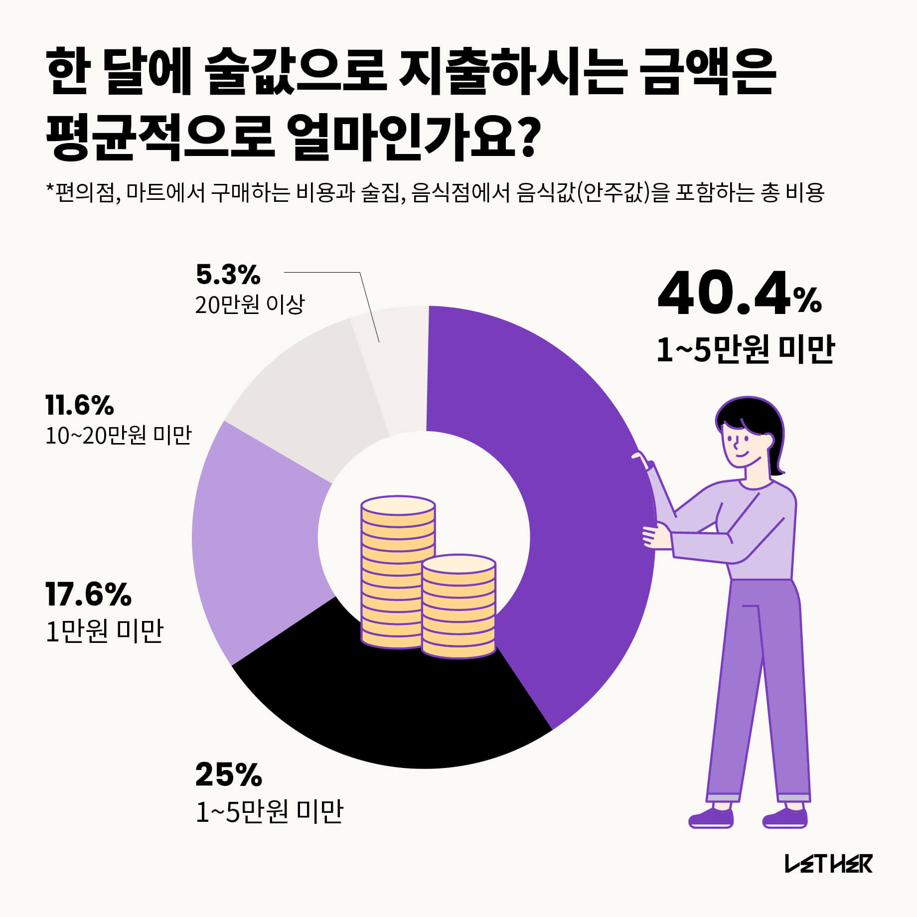 술값 지출 금액은 5만원 미만을 가장 많았다. 앞서 실시한 음주량 조사에서 가장 많은 응답자가 한 달에 1회 이하 마신다고 선택한 것과 상응하는 결과다. 다음은 5~10만원 미만, 1만원 미만 순이다.