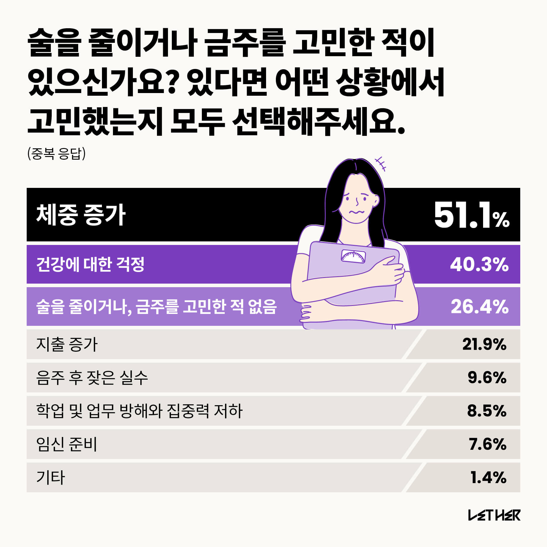 73.6%가 술을 줄이거나 금주 고민한 적이 있다고 답했다. 그 이유로 가장 많은 사람이 체중 증가를 꼽았으며 다음은 건강에 대한 걱정이 뒤를 이었다. 이 외에 지출 증가에 대한 부담도 금주를 고민하게 한 것으로 나타났다. 연령대 별로 보면 다른 연령 대에 비해 40대는 건강에 대한 걱정, 20대는 지출 증가로 금주나 절주를 고민한 것으로 나타났다.