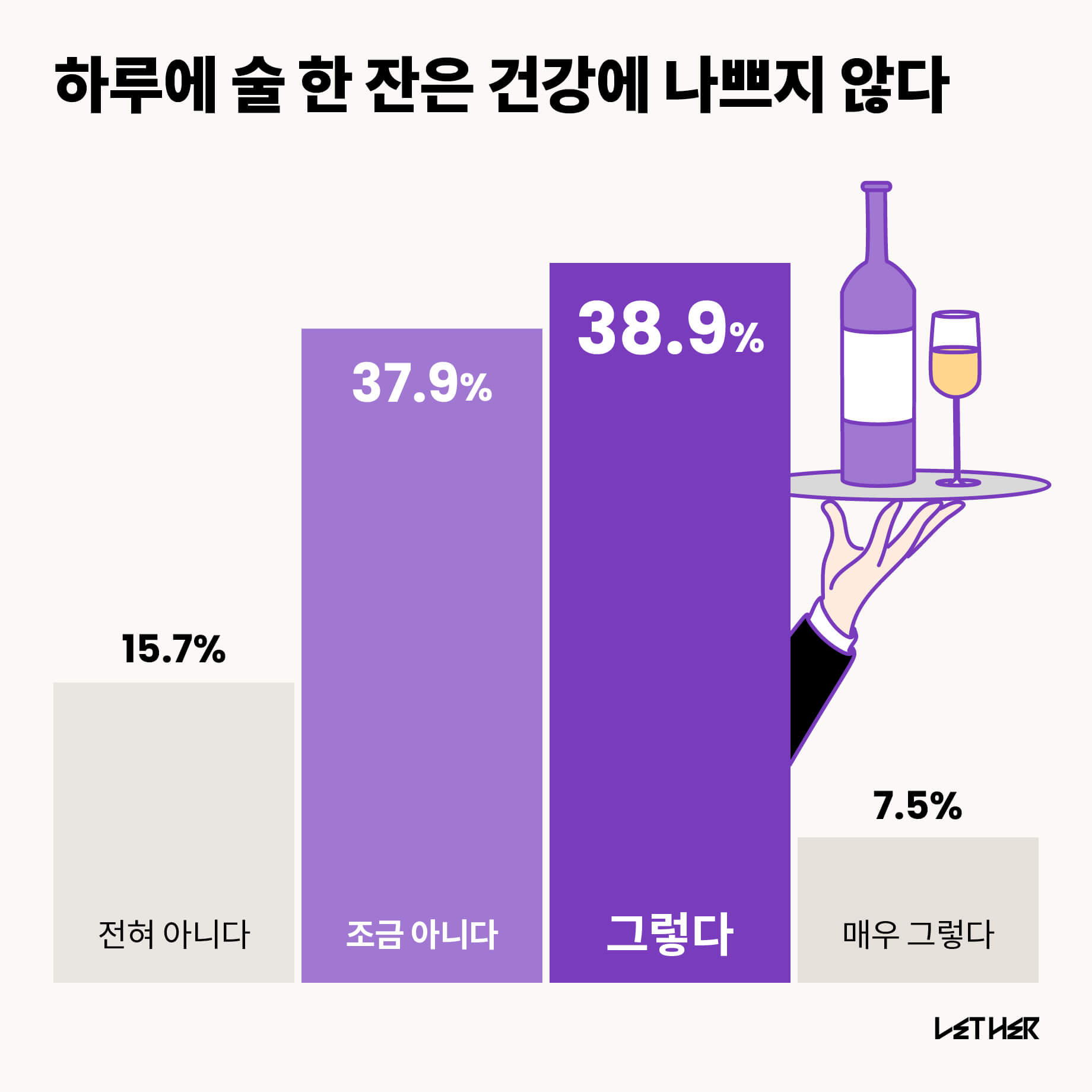 38.9%가 그렇다를 선택해 술 한 잔은 건강에 나쁘지 않다고 답했다. 그 다음은 조금 아니다로, 1%의 근소한 차이를 보였다. 그러나 전체 평균으로 구분해보면 건강에 나쁘다고 생각한 사람이 53.6%로 가장 많다. 과반이 술 한 잔도 건강에는 좋지 않다는 인식을 갖고 있음을 알 수 있었다.